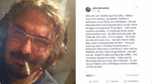 Professor acovarda-se e diz que errou ao pedir que o presidente tomasse o raticida “Ri do Rato” Júlio Bernardes, que hoje usou o seu Facebook para recomendar que Bolsonaro mate sua filha Laura, a mulher Michele e depois se suicide, usando raticida, chocou e revoltou a cidade.